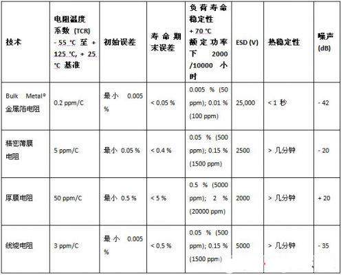 各种电阻技术的优缺点如表1所示,表中给出了热应力和机械应力对电阻电气特性的影响。