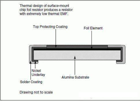 将具有已知和可控特性的特种金属箔片敷在特殊陶瓷基片上,形成热机平衡力对于电阻成型是十分重要的。然后,采用超精密工艺光刻电阻电路。这种工艺将低 TCR、长期稳定性、无感抗、无 ESD 感应、低电容、快速热稳定性和低噪声等重要特性结合在一种电阻技术中。