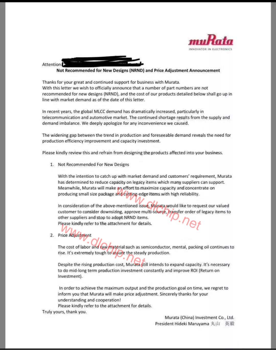 服务时间 :09:00-19:007月6日,全球积层陶瓷电容龙头厂商村田制作所(Murata)向代理商发送了一份主题为不推荐新设计(NRND)及价格调整的公告。