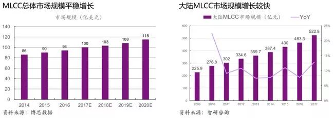 整体来看,MLCC总体市场规模平稳增长,博思数据预到2020年,MLCC整体市场规模将达到115亿美金,2017—2020年间的复合增速约5.17%,总体上呈现平稳增长。相较之下,大陆MLCC市场规模增长较快,根据智研咨询的数据,大陆2010— 2017年间的复合增速约11.06%,高于全球平均水平。2017年大陆MLCC消费量达到3.058万亿只,占全球消费量的68.4%。