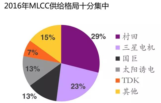 MLCC供应商格局呈现出高度集中的局面,前五大厂商占据87%的市场份额,主要为日本、韩国、 中国台湾厂商。历经多次景气循环周期后,主要厂商均对扩产十分谨慎。