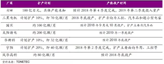 尽管目前MLCC面临紧缺,但由于日系厂商坚决将产能从利润微薄的常规型转向利润丰厚的车载、工控市场,导致新增产能有限,且新增产能主要是超小、车载、工控等高端产品。根据各大厂商公布的扩产计划,新产能投产集中在2018年底或2019年。