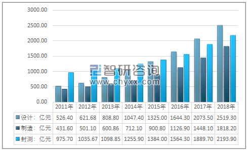 2011-2018年我国集成电路设计、制造、封装测试环节销售收入统计图