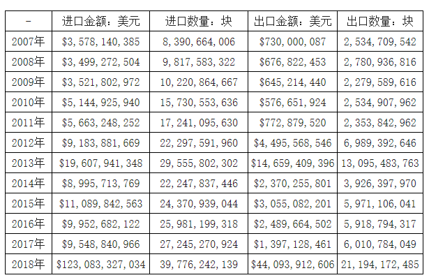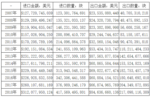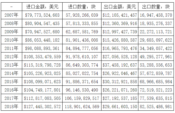 2007-2018年我国集成电路进出口统计表