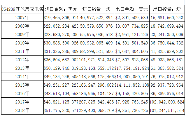 2018年我国其他集成电路进口数量为2294.03亿块,进口数量同比增长40.38%;进口金额为517.75亿美元,进口金额同比增长6.05%;2018年我国其他集成电路出口数量为1072.45亿块,出口数量同比增长5.10%;出口金额为93.62亿美元,出口金额同比增长18.07%。