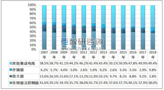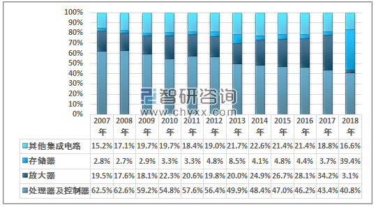 2018年我国处理器及控制器进口金额占同期集成电路进口总额的40.8%;放大器进口金额占比为3.1%;存储器进口金额占比为39.4%。