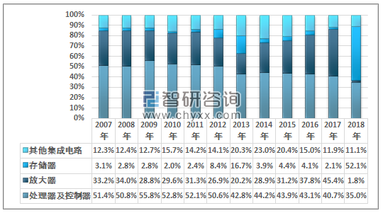 2018年我国处理器及控制器出口金额占同期集成电路出口总额的35.0%;放大器出口金额占比为1.8%;存储器出口金额占比激增至52.1%。