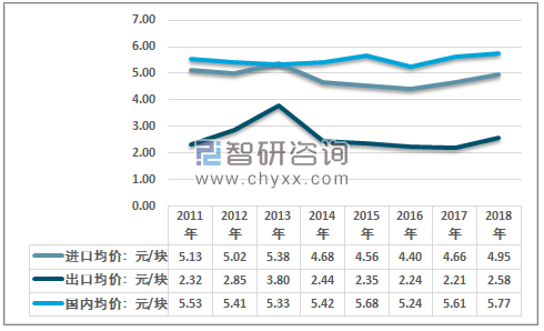 据测算:2018年我国集成电路平均价格为5.77元/块,同期进口产品均价为4.95元/块,出口产品均价为2.58元/块。