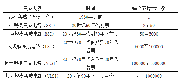 从1958年7月德州仪器的Jack Kilby在锗半导体材料商制作出第一块集成电路以来,每个芯片上的器件数持续增长。根据每个芯片上的元件数量,即集成度的高低,可将集成电路分为小、中、大、超大、甚大规模集成电路。随着集成度不断提高,集成电路的价格持续下降。