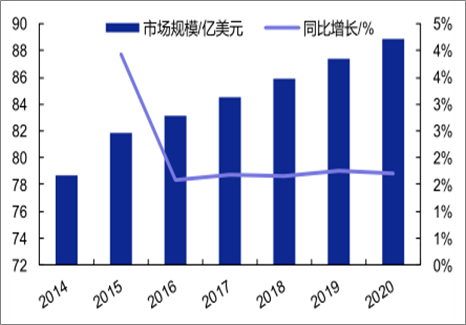 MLCC作为应用最为广泛的基础元器件,随着技术不断进步、性能不断提高,已成为全球用量最大、发展最快的片式元器件之一。中国作为全球主要的消费性电子产品生产基地,已成为全球陶瓷电容器生产大国和消费大国,产销量位居全球前列。根据数据,2015 年全球 MLCC市场规模约为81.8亿美元,同比增长3.9%;预计到 2020年达到88.9亿美元。2013 年中国MLCC 产品市场规模为359.7亿元。