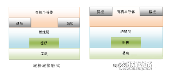 根据栅极的位置来划分底栅和顶栅,底栅式栅极沉积在栅绝缘层的下方位置,顶栅则是栅极沉积在有机半导体和绝缘层的上方;又根据有机半导体和源漏电极的位置来划分,顶接触是有机半导体先生长在栅绝缘层再进行源漏电极的沉积,而底接触是有机半导体的基层是源漏电极和山绝缘层。