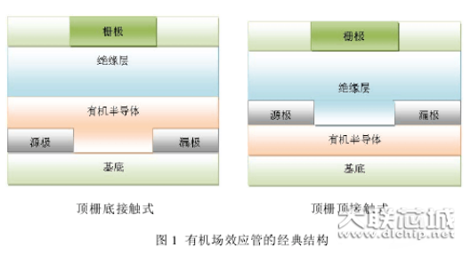 有机场效应晶体管由三个电极:源极、漏极和栅极、以及有机半导体层和栅绝缘层组成。另外,根据器件的结构,有机场效应晶体管可以分为四类:底栅底接触式、顶栅顶接触式和项栅底接触式。