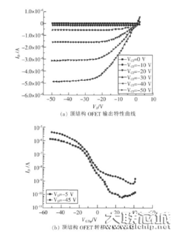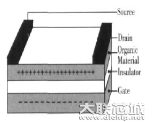 有机场效应晶体管在结构上类似一个电容器,源、漏电极和有机半导体薄膜的导电沟道相当于一个极板,栅极相当于另一个极板。当在栅、源之间加上负电压从VGS后,就会在绝缘层附近的半导体层中感应出带正电的空穴,栅极处会积祟带负电的电子。