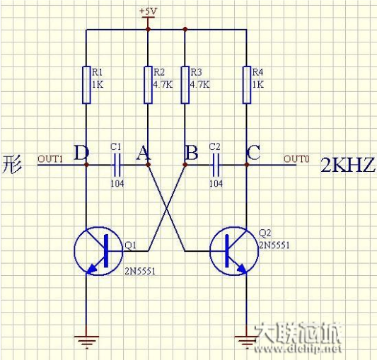 在上述多谐振荡电路原理图中两只晶体管不会是完全相同的,因此,即使两级用的是相同型号的晶体管和用相同的元件值,一个晶体管也会比另一个起始导电量稍微大些。
