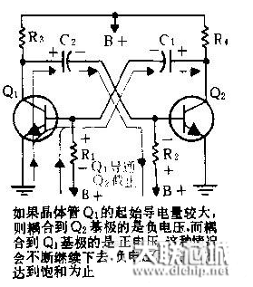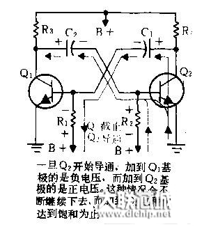 Q2集电极升高的电压,是作为正电压藕合回Ql基极的。这样,Q1导电更多,从而引起它的集电极电压进一步下降,由于C2还在放电。故驱使Q2的基极电压向负的增大。