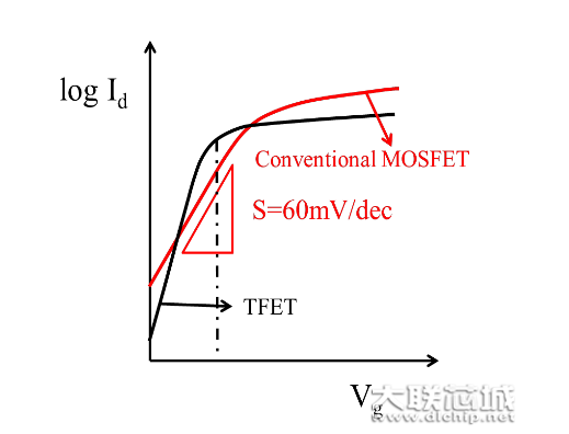 如下图所示,在较小的栅电压的条件下,tfet的ion/ioff都会大于传统mosfte的ion/ioff。