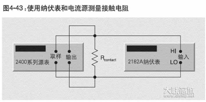 图4-43示出使用Keithley 2182A型纳伏表和2400系列数字源表仪器进行接触电阻测量的测试配置情况。