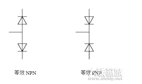 三极管分两个类型NPN和PNP,为便于说明将三极管用两个二极管进行等效,但两个二极管永远不能组成一个三极管。
