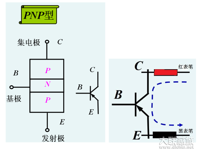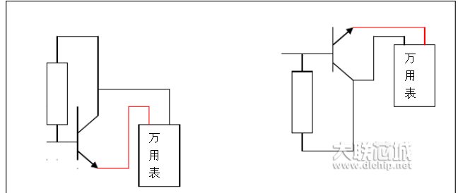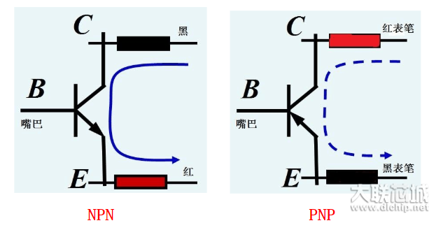 (2)对于PNP型的三极管,道理也类似于NPN型,其电流流向一定是:黑表笔→e极→b极→c极→红表笔,其电流流向也与三极管符号中的箭头方向一致,所以此时黑表笔所接的一定是发射极e,红表笔所接的一定是集电极c。