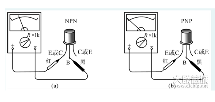 PN结的方向来确定管子的导电类型。将万用表的黑表笔接触基极,红表笔接触另外两个电极中的任一电极,若表头指针偏转角度很大,则说明被测三极管为NPN型管;若表头指针偏转角度很小,则被测管即为PNP型。