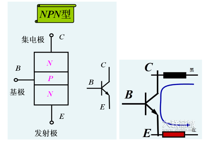 发射区和基区之间的PN结叫发射结,集电区和基区之间的PN结叫集电极。基区很薄,而发射区较厚,杂质浓度大,PNP型三极管发射区“发射”的是空穴,其移动方向与电流方向一致,故发射极箭头向里;NPN型三极管发射区“发射”的是自由电子,其移动方向与电流方向相反,故发射极箭头向外。发射极箭头指向也是PN结在正向电压下的导通方向。硅晶体三极管和锗晶体三极管都有PNP型和NPN型两种类型。