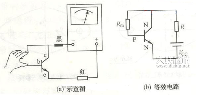 若在“顺箭头,偏转大”的测量过程中,若由于颠倒前后的两次测量指针偏转均太小难以区分时,就要“动嘴巴”了。具体方法是:在两次测量中,用两只手分别捏住两表笔与管脚的结合部,用嘴巴含住(或用舌头抵住)基电极b,仍用“顺箭头,偏转大”的判别方法即可区分开集电极c与发射极e。其中人体起到直流偏置电阻的作用,目的是使效果更加明显。