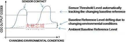 保持可靠性能。容性传感器电极是采用PCB上的标准铜材料或柔性材料制成的。这种材料的特性会随温度和湿度的变化而发生改变。这种变化会使基线电平发生偏移(所有传感器阈值电平均是以基线电平为参考的)。较大的基线偏移增加了接触阈值电平过低或过高的风险(过低还是过高取决于基线偏移的方向)这会引起虚假的接触误差,或使阈值电平不是太灵敏就是不够灵敏,导致接触状态的不稳定。为保持传感器原始的信号接触阈值检测电平余量(灵敏度),CDC需要自动跟踪基线偏移误差的幅度,并对阈值设置进行相应的重新调整。图2中的示例介绍了AD7147和AD7148的阈值电平如何针对因环境条件变化引起的基线失调变化进行自动跟踪和调整。