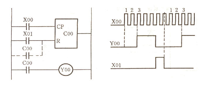 计数器有一个时钟脉冲端(CP),它接受PLC内各种软继电器送入的脉冲信号,在图4中为输入继电器触点X00,当X00由断开到闭合,每变换一次输入一个脉冲信号,那么,计数器就从当前值减1,直到计数器当前值为0时,计数器线圈通电,它的常开触点闭合、常闭触