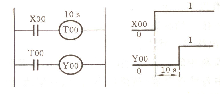 图6为定时器功能图,当输入继电器X00接受到输入信号后,触点X00接通,即为逻辑1状态,定时器线圈通电开始计时,经过设定时间(图中为10s)后,其常开触点TOO闭合,输出继电器Y00线圈通电即为1状态。
