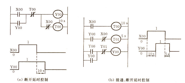 当输入信号X00消失时,定时器线圈TOO通电,到达设定时间后,TOO常闭触点断开,Y00线圈断电。因此构成了常开断电延时触点。