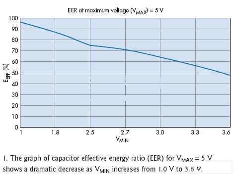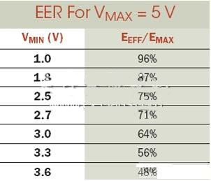 其中EMAX代表电容器存储的总能量。等式2明确表明,随着我们通过减少电容器内的驻留电能,而降低了被供电电路的最低工作电压VMIN,有效能效比可获得极大地提升。对任何以电容供电的电路来说,能效比都是一个非常重要的设计考虑。