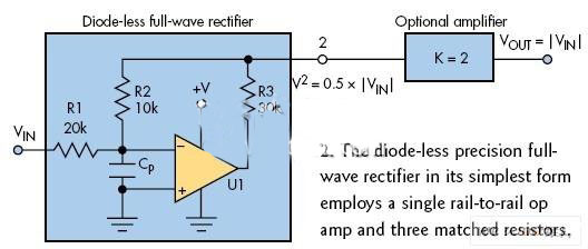 图2:最简单的无二极管精精密全波整流器采用单个轨至轨运算放大器和三个匹配的电阻。