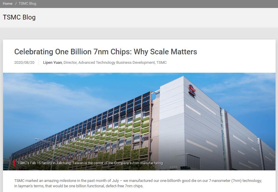 博客文章写道:“我们的7nm技术比以前的任何台积电技术都更快地实现了大批量生产”,“作为第一家将EUV投入7nm时代商业化生产的公司,我们积累的经验使我们今年能够批量生产5nm技术”。
