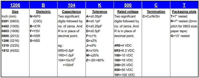例如华科电容型号:1206 B 104 K 500 C T