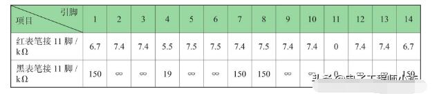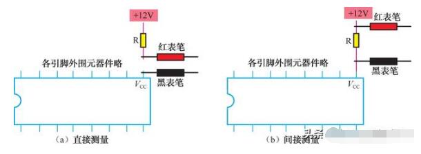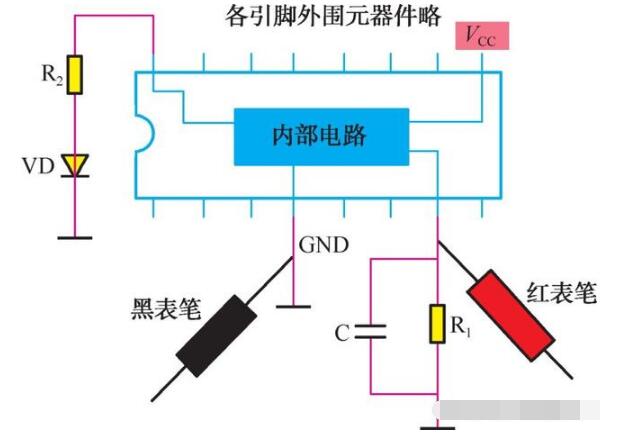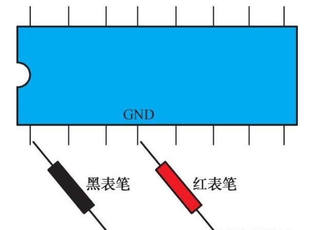 集成电路都有一个接地引脚(GND),其他各引脚与接地引脚之间都有一定的电阻,由于同型号的集成电路内部电路相同,因此同型号的正常集成电路的各引脚与接地引脚之间的电阻均是相同的。根据这一点,可使用开路测量电阻的方法来判别集成电路的好坏。