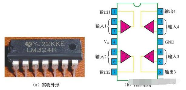 采用开路测量电阻法判别集成电路的好坏比较准确,并且对大多数集成电路都适用,其缺点是检测时需要找一个同型号的正常集成电路作为对照,解决这个问题的方法是平时多测量一些常用集成电路的开路电阻数据,以便以后检测同型号集成电路时作为参考,另外也可查阅一些资料来获得这方面的数据。图12-19所示是一种常用的内部有四个运算放大器的集成电路LM324,表12-15列出了其开路电阻数据,测量使用数字万用表200kΩ挡。表中有两组数据,一组为红表笔接11脚(接地脚)、黑表笔接其他各脚测得的数据;另一组为黑表笔接11脚、红表笔接其他各脚测得的数据。检测LM324好坏时,也应使用数字万用表的200kΩ挡,再将实测的各引脚数据与表中数据进行对照来判别所测集成电路的好坏。