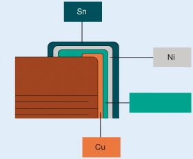 因此,易容网代理了多款具有软弹性端子的积层陶瓷电容品牌。诸多的品牌都有一定的优势,其中一款软端子积层陶瓷电容采用了吸收和减少电路板的挠曲应力的设计。在铜质平板和端电极镍镀间使用导电树脂电极层,作用是吸收和减弱因高温和震荡等因素而导致的电路板的挠曲应力,由此抑制焊接裂缝的形成。导电树脂本身由环氧树脂或其它合成树脂与导电颗粒填料(如银)混合而成。