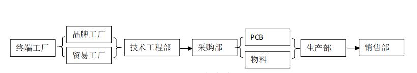 简述一下流程是:终端工厂成立了技术部门,设计好方案后制作出来PCB的生产文件,形成了BOM资料,发给采购去采购物料;采购把物料采购回来后放入仓库进行管理,待料齐后安排生产;生产部把产品生产好后交付到仓库并给到销售部进行销售。