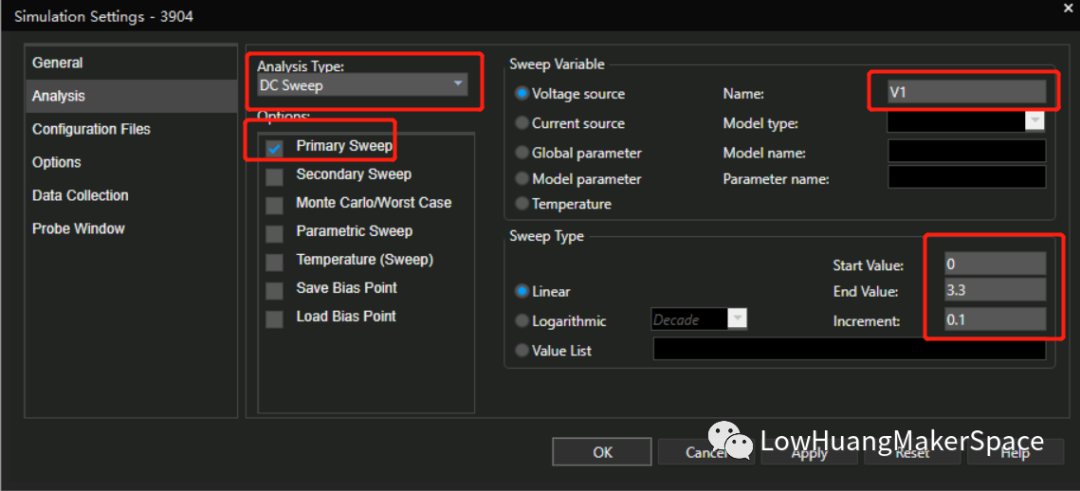 我们以V1设为自变量,从0-3.3V变化,观察Ib和Ic的电流变化曲线