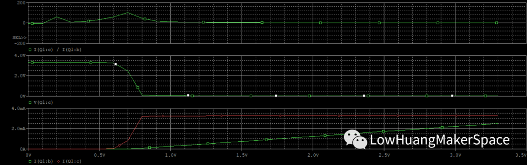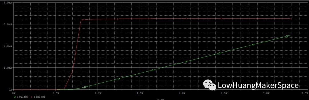 图中,X轴为V1从0-3.3V变化,Y轴为电流,这里绿色为Ib的变化,红色为Ic的变化,从图中我们可以看出
