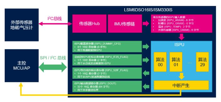 在LSM6DSO16IS/ISM330IS的IMU内部框架中,传感器hub可以通过I2C连接外部磁力计和气压计等设备。ISPU可以通过内部的IMU传感链直接读取外部的传感器(地磁或气压计)和内部的加速度、陀螺仪和温度数据。ISPU支持运行最多30个算法,但由于ISPU是单核,它以串型的方式运行,每一个算法都可以产生一个中断信号,通知主控发生的中断事件。