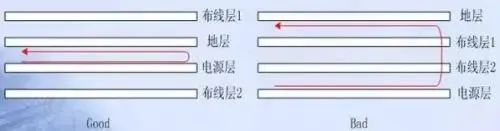 1、布线层的投影平面应该在其回流平面层区域内。布线层如果不在其回流平面层地投影区域内,在布线时将会有信号线在投影区域外,导致“边缘辐射”问题,并且还会导致信号回路面积地增大,导致差模辐射增大。