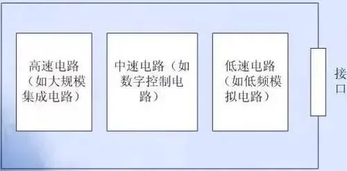 2、多种模块电路在同一 PCB 上放置时,数字电路与模拟电路、高速与低速电路应分开布局,以避免数字电路、模拟电路、高速电路以及低速电路之间的互相干扰。另外,当线路板上同时存在高、中、低速电路时,为了避免高频电路噪声通过接口向外辐射,应该遵从图 7 中的布局原则。