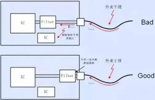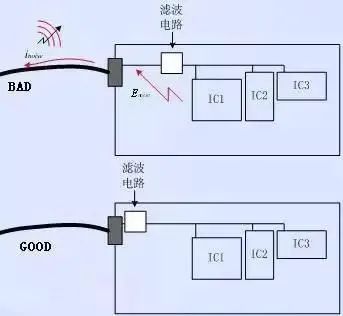3、线路板电源输入口的滤波电路应应靠近接口放置,避免已经经过了滤波的线路被再次耦合。