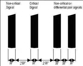 1、布线分离:布线分离的作用是将 PCB 同一层内相邻线路之间的串扰和噪声耦合最小化。3W 规范表明所有的信号(时钟,视频,音频,复位等等)都必须象图 10 所示那样,在线与线,边沿到边沿间予以隔离。