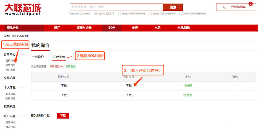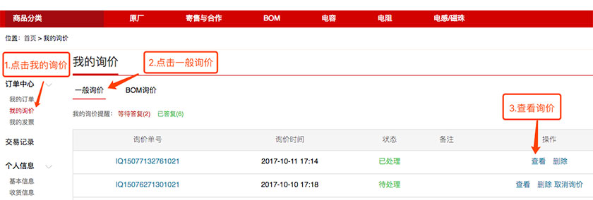 2.我们收到您的bom单会有客服尽快给您回复,同时回复的bom单可以在后台查询。